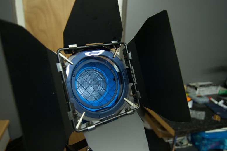 It works, but it takes up a whole gel, or one that has been cut (if you aren’t as precious over gels as me), and can make it more difficult to move the barn doors, and it can fall off. There seems to be quite a bit of wasted gel in this method that is just getting scrunched up by the pegs. I was contemplating getting some additional CTB gels, to go with some new fresnel lamps that I have just got, and it suddenly dawned on me whilst looking at the new barn doors. Why not cut out a circle of gel and clip it to the inside of the barn doors? Not only would it mean that the gels go much further and I wouldn’t have to buy any new ones, but also, once clipped in, it wouldn’t get in the way of the operation of the barn doors, perfect!